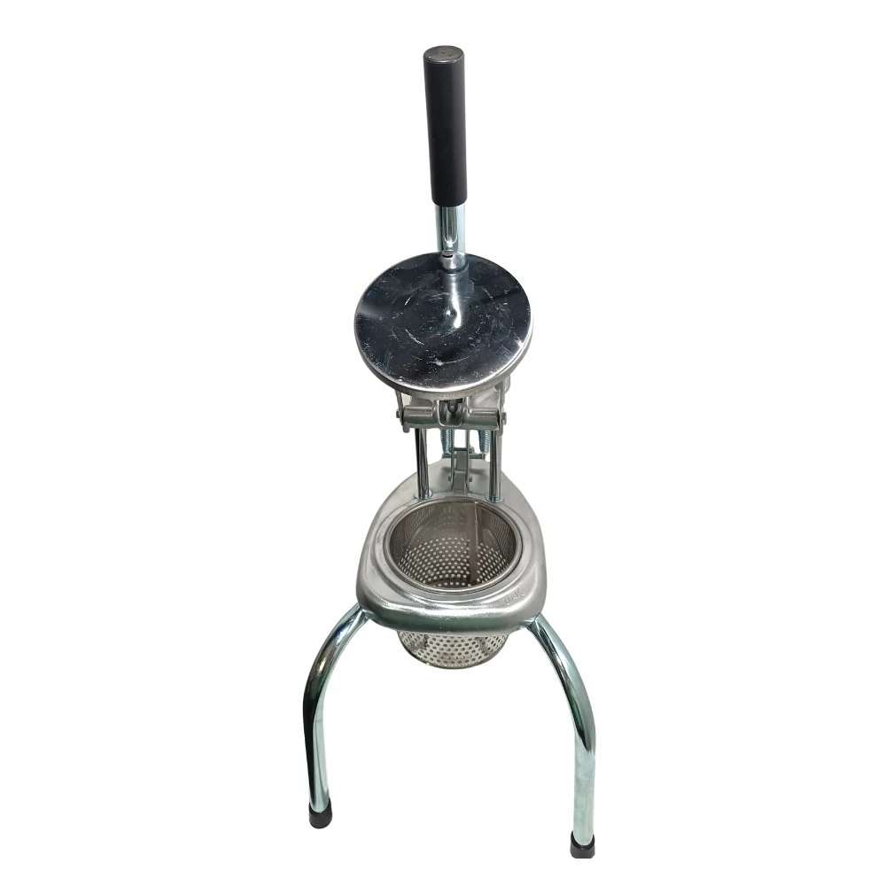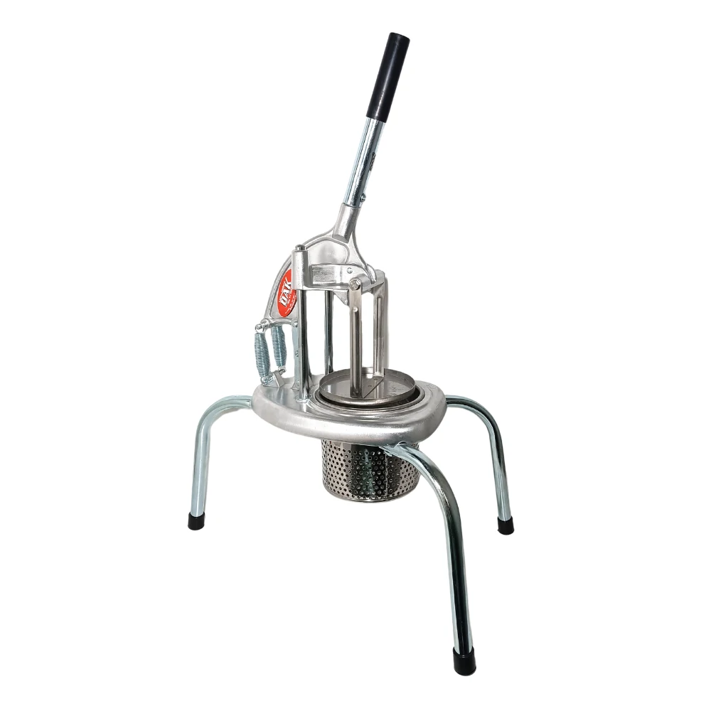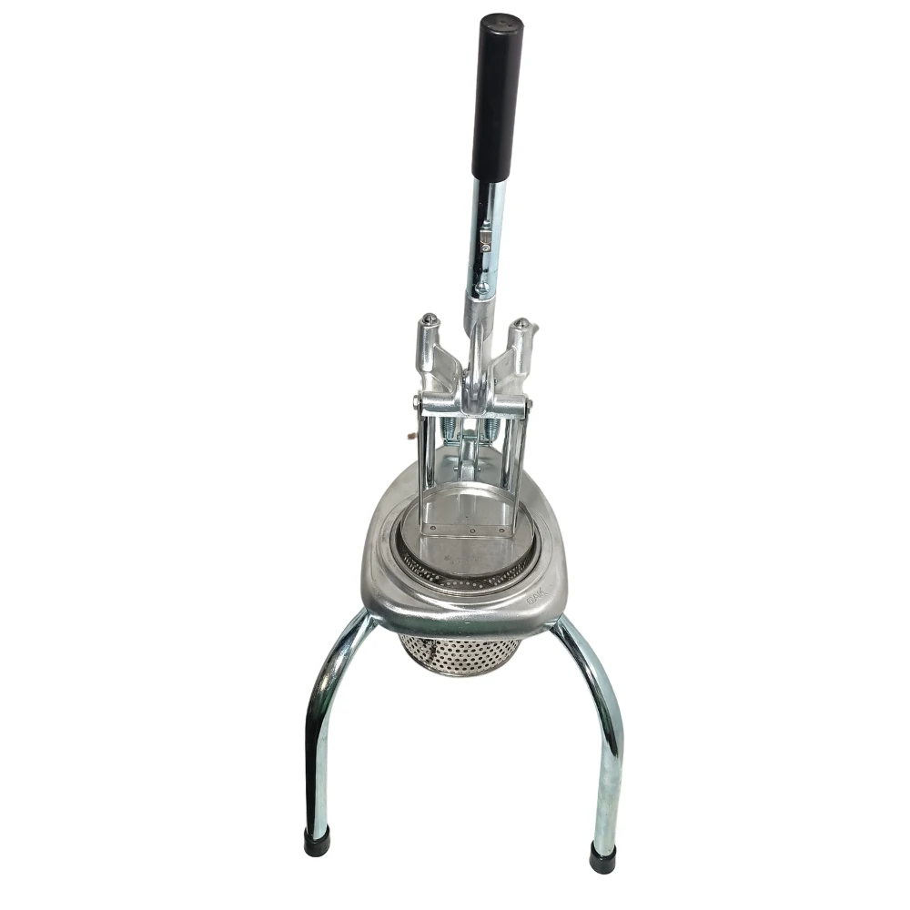 Este espremedor de batata de tamanho médio é utilizado sobre um suporte, como mesas e balcões.