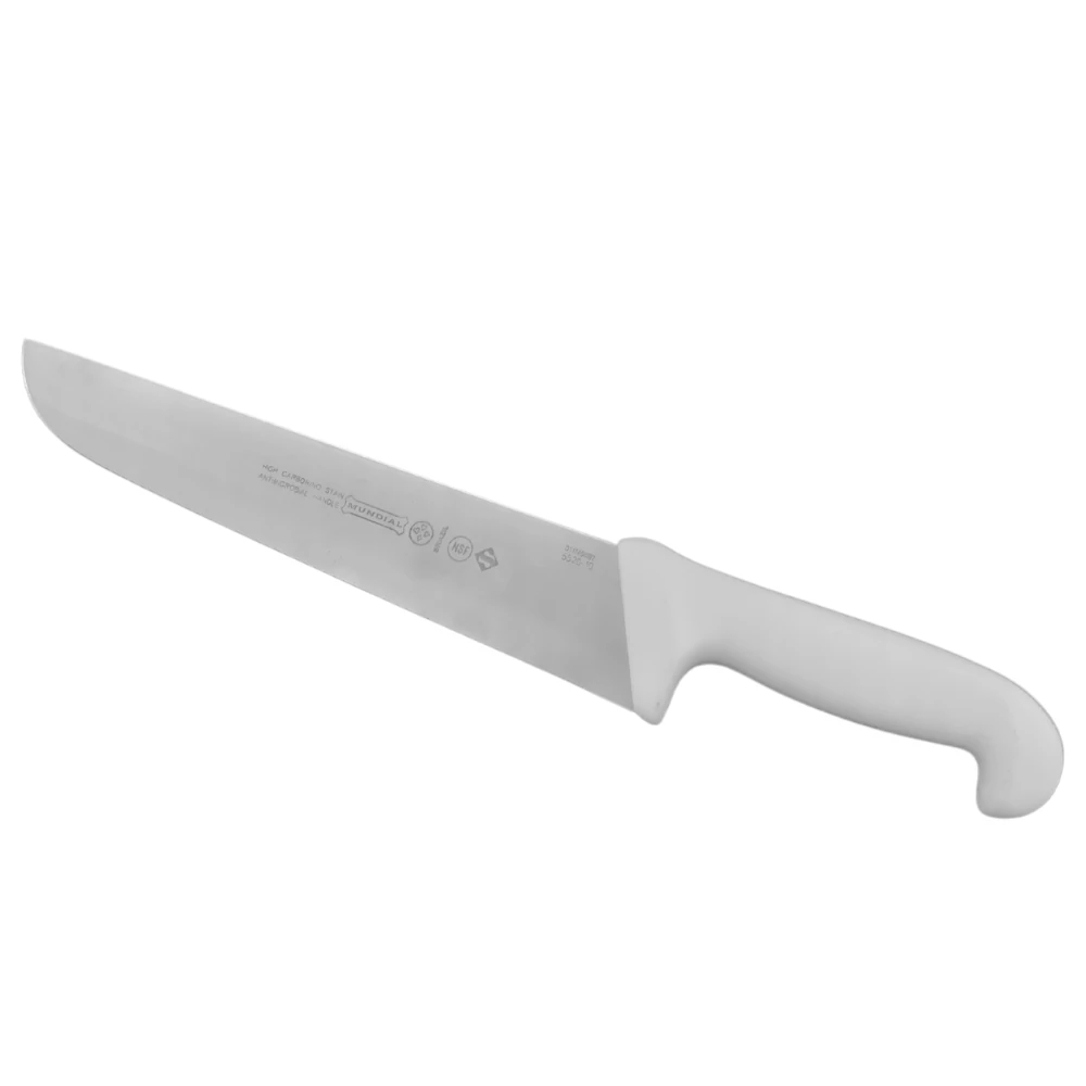 Faca Mundial de 10 polegadas 5520/10 para cortar bife com lâmina em inox de 26,5 cm de comprimento e 5 cm de largura com cabo branco.